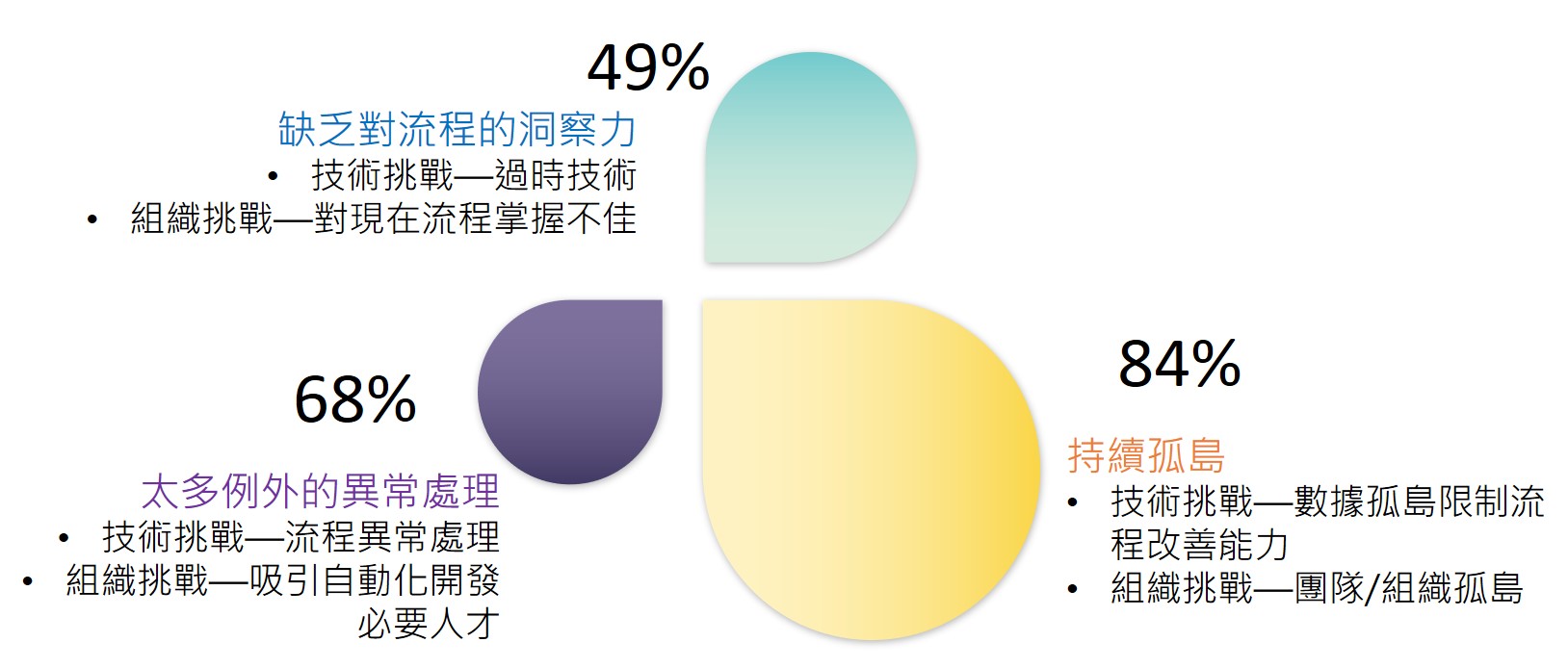 2.太多例外 , 68% 的決策者表示流程異常會破壞原本高效的工作流程。超過一半的人認為異常處理是一項主要的技術挑戰。此外決策者亦表示,在整個技術推動中吸引必要的人才,以建構更智慧化的流程並最有效地實現自動化也是主要的挑戰之一。